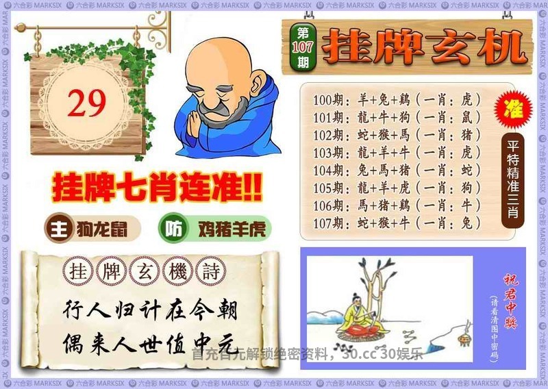 107期:⑦肖 | 羊狗马猴牛鸡虎 | 开:鸡33中 |